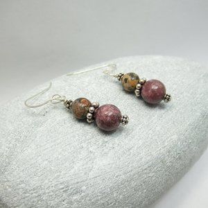 This listing is for the pair of Sterling silver and gemstone earrings pictured. They were made by me using leopardskin jasper and rhodonite gemstone beads and vintage Bali sterling beads. They are new and have never been worn, but are old stock that I had in storage. They hang from 925 sterling silver earwires.