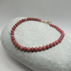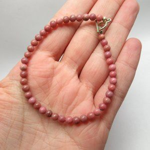 This listing is for the pink Rhodonite gemstone bead bracelet pictured. This bracelet measures 7.5 inches and is finished with a Sterling toggle clasp stamped 925. This bracelet is from my collection of jewelry that I have made over the years. It is in good unworn only stored condition. It is made with handpicked pink or mostly pink Rhodonite gemstone beads and Sterling silver findings. It has a nice natural pink color.