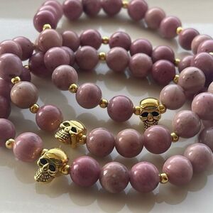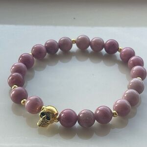 Rhodonite skull gold tone ONE stretch bracelet NEW crystal meditation yoga stone