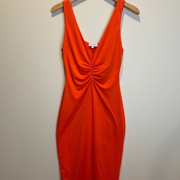Rhomba, melon-orange, deep-v plunge dress, ruched breast. Double-lined. Stretchy. Perfect for brunch. Worn once.