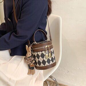 Rhomboid Patterned Faux Leather Crossbody Bag with Bunny Pendant — A chic retro vibe with a playful touch.