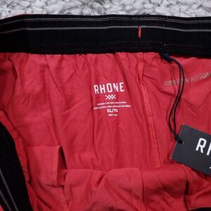 Men's Rhone Element Lounge Pants in red. Drawstring lounge or pajama pants with pockets and logo. New with tags. Organic pima cotton blend. Men's size XL or extra large, real measurements shown in photos with pants laid flat: