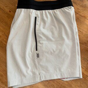 Grey with black waist band - 5" inseam, drawstring, two front slant pockets