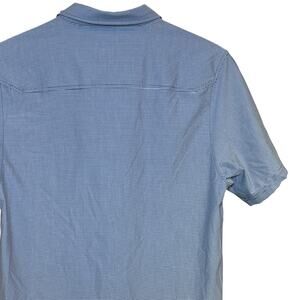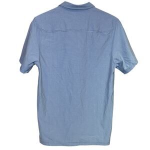 Rhone men’s gray striped polo shirt in size S/P. Soft, lightweight, and breathable fabric designed for all-day comfort. Features subtle horizontal stripes, short sleeves, and a classic button-down collar. Perfect for golf, travel, or casual wear.