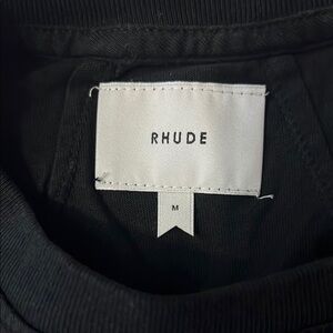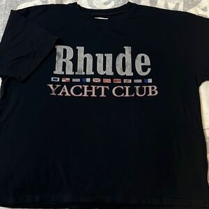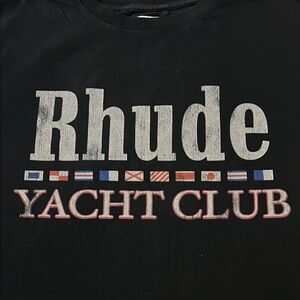 Stylish black tee with bold Rhude logo. Features nautical flag design.