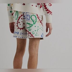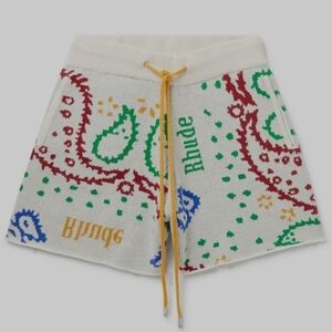Vibrant knit shorts by Rhude. Features multicolor patterns on a cream base. Stylish and comfortable.