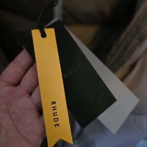 Cozy puffer jacket by Rhude. Features bold logo on back. Ideal for cold weather.