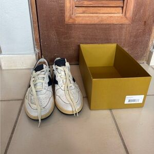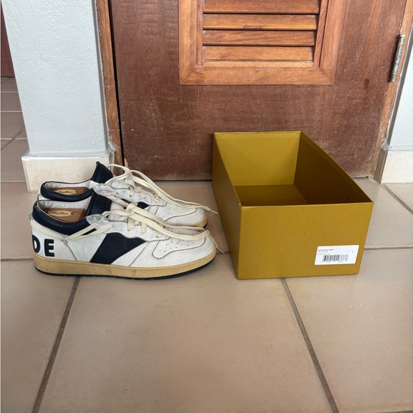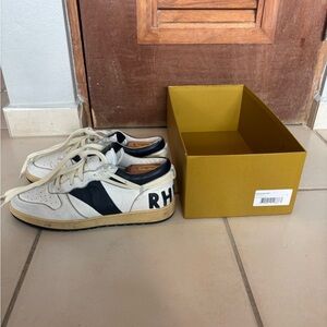 These Rhude sneakers showcase a stylish white and blue color scheme with a low-top silhouette, perfect for casual wear. The leather-like upper features perforated details and contrasting overlays, offering a classic athletic look. With a well-constructed design, they provide both comfort and versatility for everyday use.
