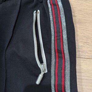 Traxedo stripe trousers feature an elasticated waist, yellow drawcord fastening, side zipped pockets, red stripes to the side and a slim fit.