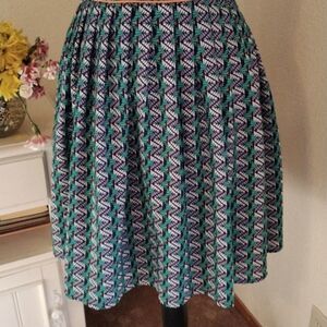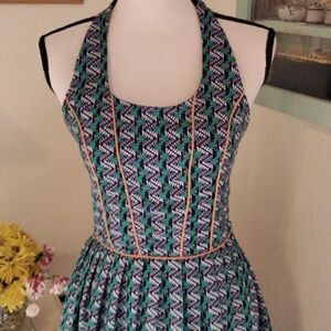 Soft woven fabric with geometric graphics. Orange piping for detail. Fitted bodice, back zip, ties at neck. Full skirt, pleated at waist. Fully lined. Size S measures 34 at chest, 26 at waist, full skirt, 35 long from shoulder to hem. Just precious and perfect for now!