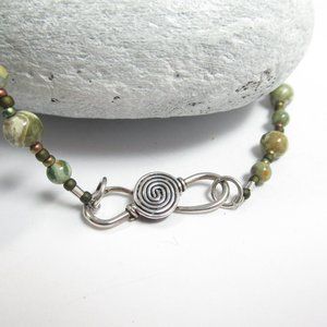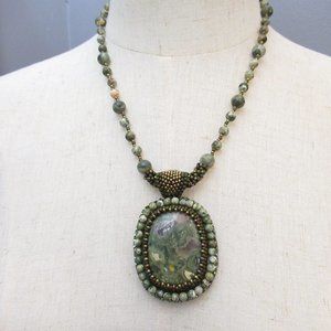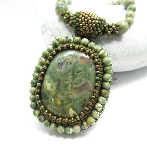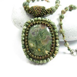 This listing is for the bead embroidered Rhyolite pendant and matching necklace pictured. It is new, was made by me and is 18.75 inches plus the about 2 inch pendant. It has a beautiful Ryolite gemstone cabochon that has been stitched with seed beads and small Rhyolite beads. The pendant is backed with a soft green leather. The matching necklace is made from a combination of hand picked matching gemstone beads spaced with seed beads. It is finished with a Sterling Silver 925 swirl S clasp. This is a one of a kind piece that I made for myself but never wore. It needs a new home where it will be loved.