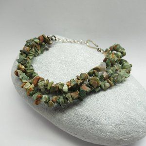 This listing is for the Rhyolite three strand gemstone chip bead bracelet pictured. This bracelet measures 6 to 7.5 inches and is finished with a Sterling bali style hook clasp stamped 925 and a silver plated extender chain. This bracelet is from my collection of jewelry that I have made over the years. It is in good unworn only stored condition. It is made with nice green mixed color Rhyolite chip beads. It has a nice natural earthy feel to it.