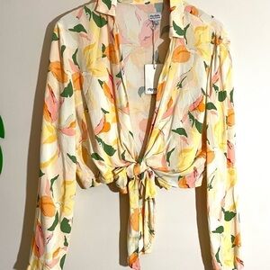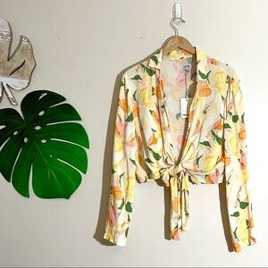 Tags: boho, resort, vacation, tropical, floral print, watercolor print, feminine, romantic, beachy, spring style, summer style, breezy, lightweight, tie front, crop top, long sleeve, pastel tones, cottagecore, soft girl, coastal, whimsical
