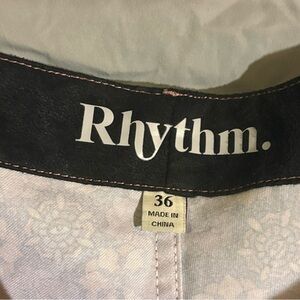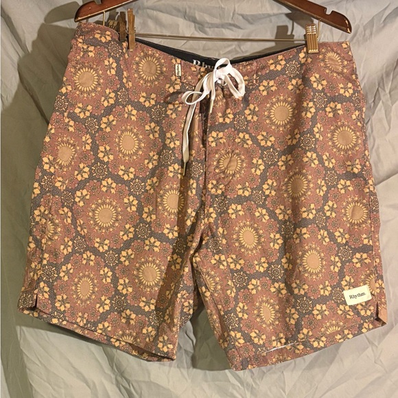 Rhythm board shorts with a floral design. Features brown and yellow tones. Ideal for beachwear.