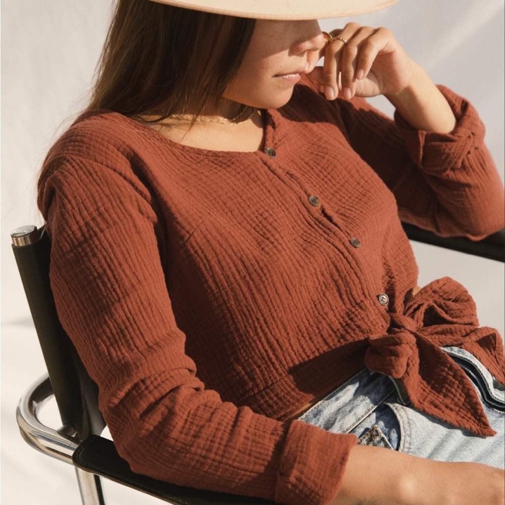 Textured rust top with button-up front. Long sleeves and tie detail at waist. Casual and stylish.