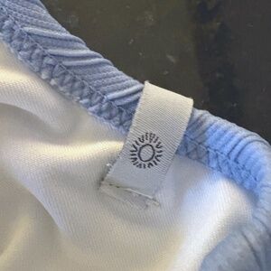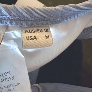 Rhythm bikini top in a "lite blue" ribbed texture with a cinched, tie front detail. It was sold by retailers such as South Moon Under.