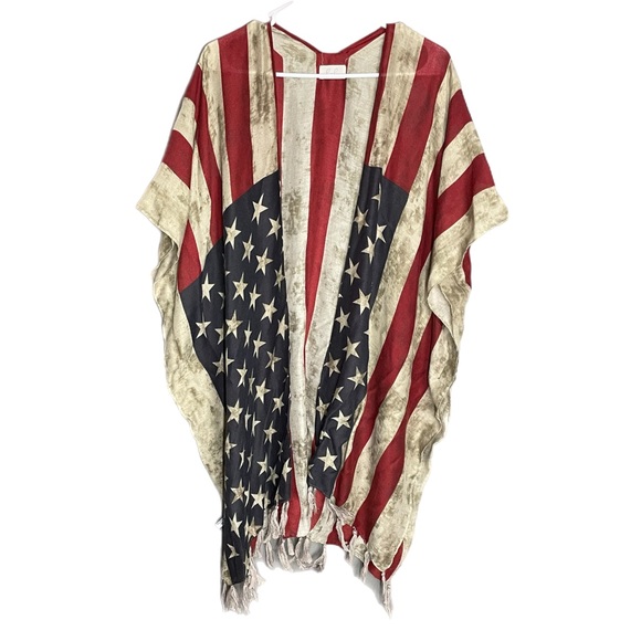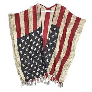 The Riah Fashion Los Angeles Open Front Cardigan is a stylish and versatile piece perfect for various occasions. Made of lightweight polyester knit fabric, this cardigan features a patriotic American Flag pattern in beige, red, and blue colors. It has 1/2 sleeves and a pullover closure with tasseled accents, adding a unique touch. The open front design and shawl/wrap top style make it a fashionable choice for travel, parties, cocktails, or casual wear during the summer, fall, or spring seasons. Perfect for women looking for a chic and comfortable addition to their wardrobe.