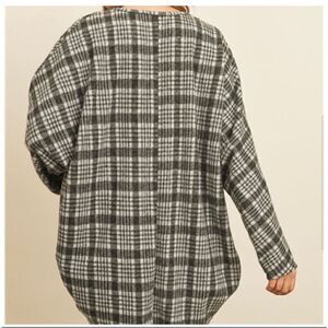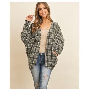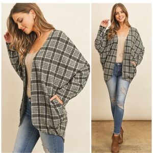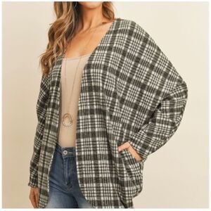 Riah Fashion Gray Open Plaid Cardigan with Pockets L