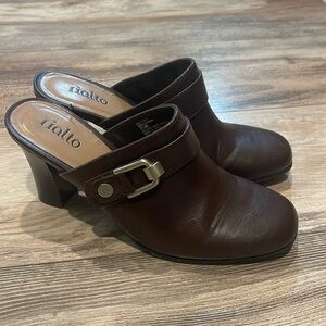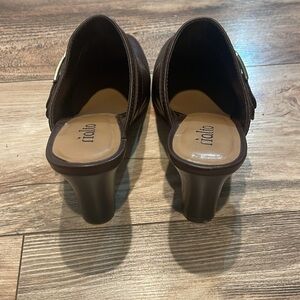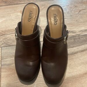 Rialto Brown Faux Leather Mules Clogs 3" heel Sz 7.5 Strap Buckle Clean Dressy, good used condition.