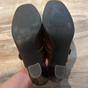 Rialto Brown Faux Leather Mules Clogs 3" heel Sz 7.5 Strap Buckle Clean Dressy