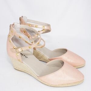 Gorgeous pearlized pink color with almond toe and gold-toned hardware stud accents on ankle strap