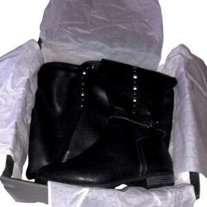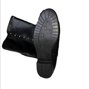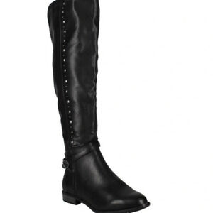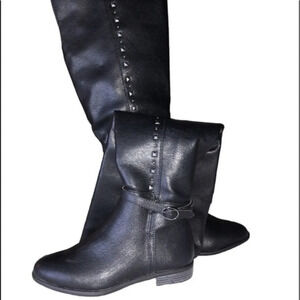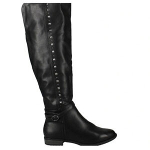 Gleaming metallic studs line the side seam and forward topline of Rialto's wide-calf Ferrell boots, bringing modern flair to the over-the-knee silhouette. • 3/4" heel • Shaft: 18-1/2" height, 16-1/2" circumference; measured on a size 6 • Round-toe boots with side zipper • Notch at back topline; wraparound strap and buckle detail at ankle; stud trim at sides • Cushioned insole for added comfort • NOTE: Shaft height and circumference vary by size. • Manmade upper; fabric lining; manmade sole