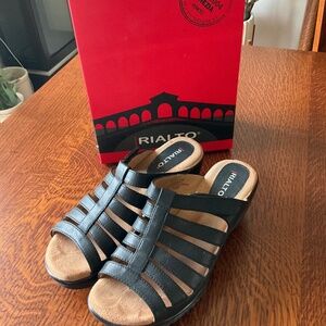 Size 8.5, black leather upper, brown Swede bottom, toe indents are from trying them on
