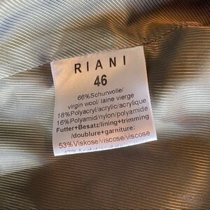 Women’s Riani Blazer jacket size 46. Excellent condition. Has virgin wool in the material. Buttons on the front with pockets. Beautiful suit jacket. Size says 46 which looks to be around a Large? Colors are kind of a blue green teal and gold