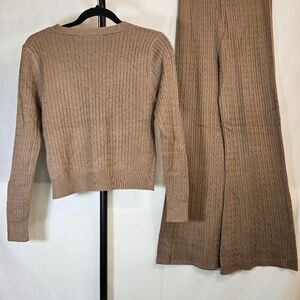 This gorgeous sweater set has buttons on the top that is v necked . The pants are bell bottoms with tie string waist.