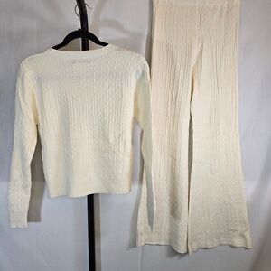 This neck sweater top has buttons and long sleeves. The pants have an elastic waist with a draw string. They are belled at the bottom. This is one of many colors we have available.