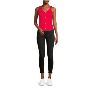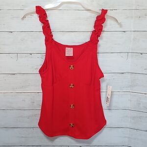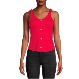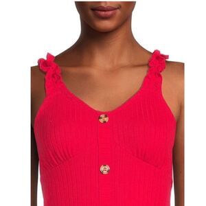 Material: 92% Polyester/8% SpandexCare: Machine washableCountry of Origin: ImportedSize: Model is 5’10” and is wearing a size MFit: Semi-fittedNeckline: V-neckClosure: Front button detailSleeves: SleevelessPockets: NoneFeatures: Yummy peached rib fabric; ruffle trimJuniors’ Ribbed Tank Top from No Boundaries