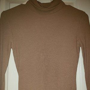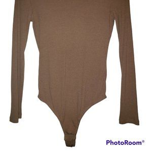 Fitted, ribbed bodysuit Double-layered stand-up collar, long, close-fitting sleeves, and concealed snap fasteners at gusset.