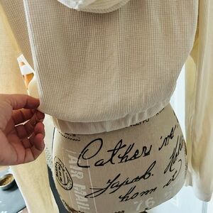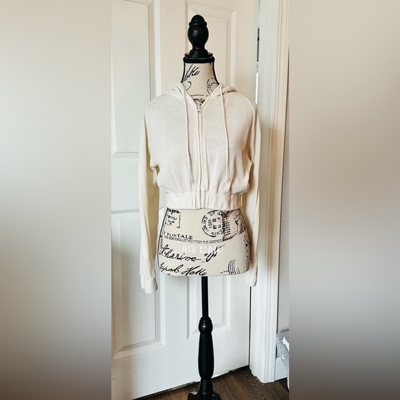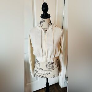 This adorable, ribbed knit hoodie featuring a drawstring hood, zip-up front closure, dropped long sleeves, and cropped hem, is perfect for a cool casual day.