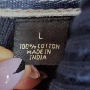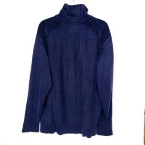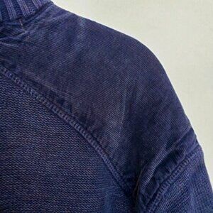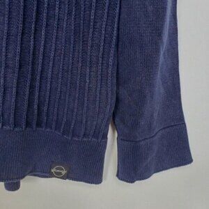 Distressed NWOT sweater by Weatherproof. High Quality! Button and zipper collar. Large rib texture. Panels on shoulders feel like corduroy. Nice weight to fabric. Soft! Faded navy blue by design. Machine Washable. Size Large. It is UNISEX! Please refer to measurements.