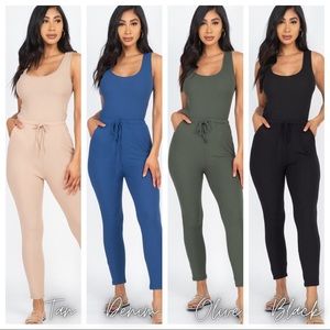 đź’™Fitted ribbed-knit jumpsuit, drawstring waist, side pockets.