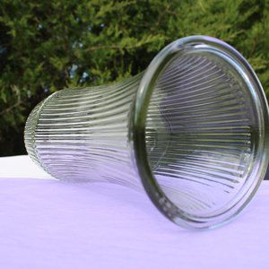 This lovely vase is in a ribbed pattern and made by “Hoosier Glass”. Produced circa 1980s and in excellent condition. No chips, cracks or scratches. The logo is still nicely legible on the bottom as well. Measuring 9 3/4in. in height.