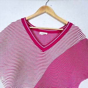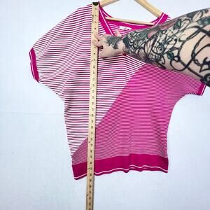 Ribbed Knit Asymmetrical Shoulder V Neck Colorblock 80s Inspired Pink Sweater L