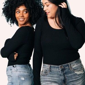 Black long sleeve solid knit bodysuit with a scoop neck featuring a back cut-out and functional snaps. Fabric is a lightweight ribbed knit.