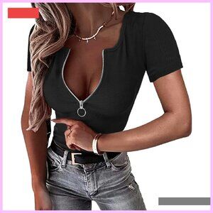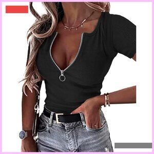 Ribbed Knit Henley Top Slim Fit V Neck Zip Up Summer Blouse