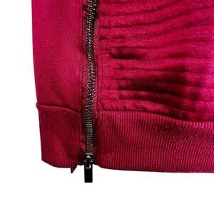This mock neck ribbed sweatshirt offers a comfortable yet polished look. The magenta tone and side zippers add versatility and modern style.