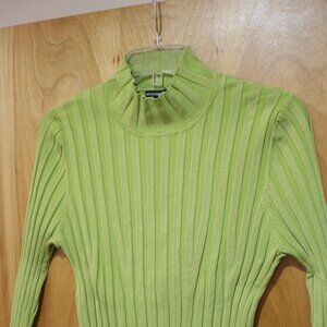 Lime green super stretchy ribbed sweater, made of 80% silk and 20% spandex. Size XL, fits snug, would also work for large or medium for a less snug fit. Hand wash, dry flat. The sleeves might be 3/4 length, it's hard to tell with how it shrinks when not worn.