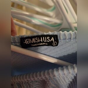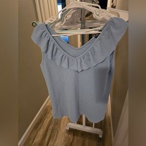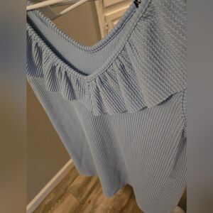 Light blue color. Very stretchy. Super cute ruffle around the top. Never worn.