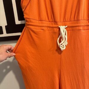 Vibrant orange sleeveless jumpsuit with a drawstring waist. Perfect for casual outings.