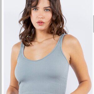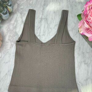 This versatile gray ribbed tank is a wardrobe essential! Features a flattering deep scoop neckline and a super soft, stretchy knit fabric that hugs in all the right places. Perfect for layering or wearing solo in warmer weather. Pairs effortlessly with jeans, joggers, or skirts for a chic, minimalist look.