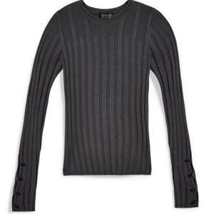 Lightweight sweater in charcoal grey with beautiful details- flattering graded ribbing, softly rolled neckline, sleeve accent buttons. This is a comfortable, thin layer easy to dress up for a work ensemble or weekend wear with a pair of favorite jeans. color Is grey- light blue photo shows the side button detail. VGUC- purchased from Nordstrom last year, only worn once