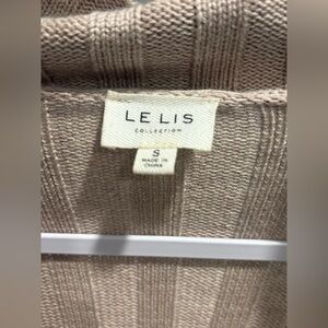 Stylish ribbed sweater with a collared neckline. Features a cozy tan color.