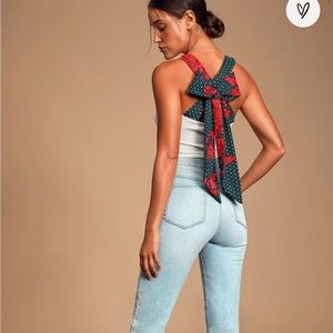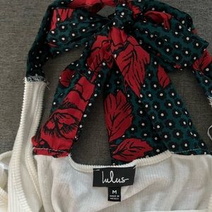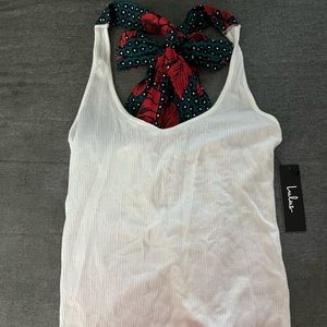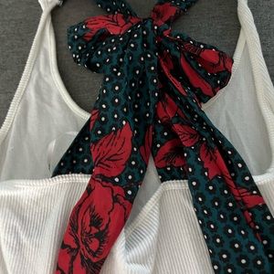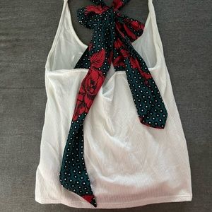 We followed our hearts and it lead us right to the Pursuit White Multi Tie-Back Ribbed Tank Top! Soft and stretchy ribbed knit shapes an essential tank top with a fitted bodice and a scoop neckline. Wide tank straps flow into a satin, mixed red and teal print scarf-style tie that criss-crosses and loops over itself before forming a stylish bow.