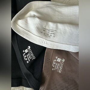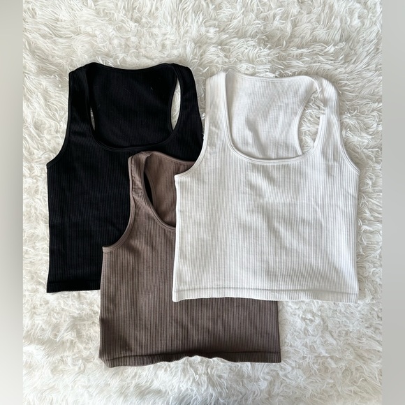 Set of ribbed tank tops in black, white, and brown. Perfect for layering or casual wear