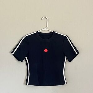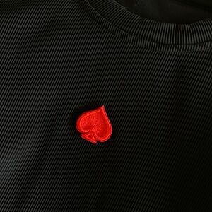 very durable material with cute red spade, slightly cropped but not completely, more of a baby tee. Only worn once.