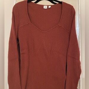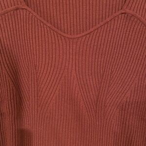 Elevate your wardrobe with this stylish ribbed V-neck top. Perfect for any occasion, this rust-colored top adds a touch of elegance to your look.